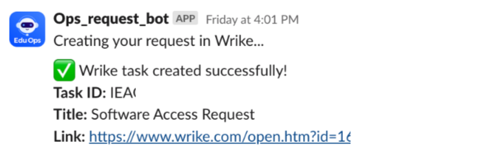 - Submit your request with full details as a regular conversation with the bot and follow its instructions (if any). You'll see a success message once it's submitted to the Ops Team, who should be able to help with it and follow up with you once done. Note: The Wrike link is for reference only, you won't be able to access it.