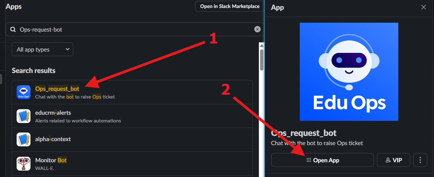 - Search for Ops_request_bot, select it, and add it to Slack/open the app.